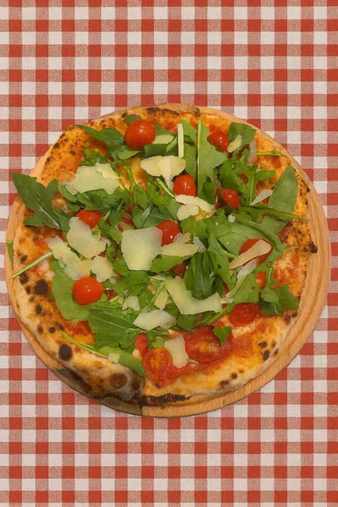 Salcë domatesh, mozzarella, rukola, parmesan, pomodorini, proshutë krudo viçi.